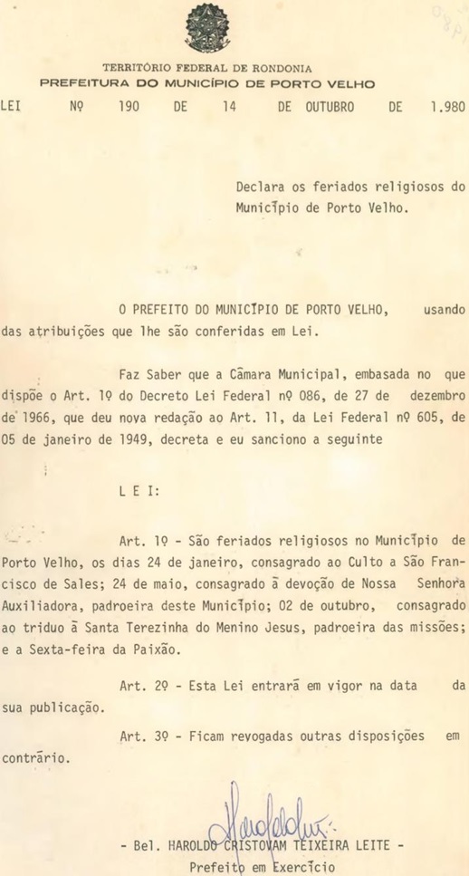 Como será visto pelo texto da lei foi bem complicado achar um motivo religioso para justificar o feriado de 2 de outubro, enquanto os de 24 de janeiro, dedicado a São Francisco de Sales, por ser patrono da congregação Salesiana e por aqui os Salesianos estavam há longo tempo, especialmente representados pelo Colégio Dom Bosco, que forneceu excelente cultura fundamental e de nível médio a muitas gerações em Porto Velho, e o dia 24 de maio, que já constava como dedicado à padroeira de nossa cidade, Nossa Senhora Auxiliadora, foram de nenhuma dificuldade dispor.