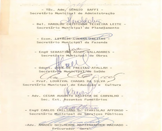 Dentre os signatários desta Lei sei que ainda percorrem as ruas de Porto Velho o Haroldo Leite, Sérgio Baffi, Sebastião Valadares e o José Atallah, que se doaram pela cidade e seu povo em tempos muito difíceis.