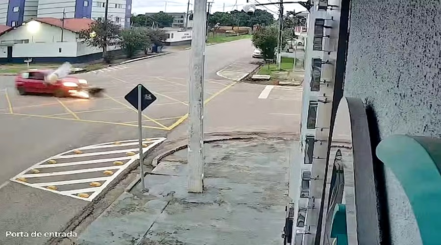 PORTO VELHO, RO - Um motociclista ficou ferido após um grave acidente de trânsito registrado na tarde de quinta-feira (22), em um cruzamento movimentado de Porto Velho. A colisão ocorreu na esquina das ruas Duque de Caxias e Elias Gorayeb e foi registrada por uma câmera de segurança, que mostra o momento em que a vítima é lançada ao solo após o impacto.