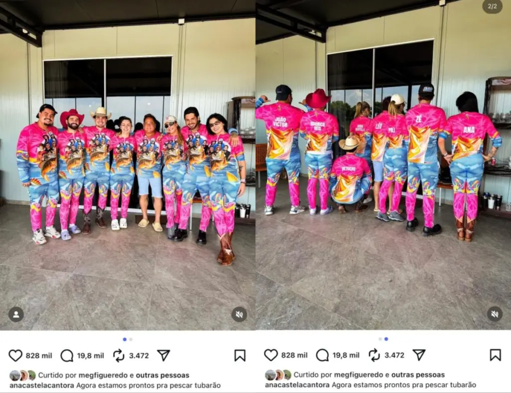 Logo na legenda, a sertaneja deixou claro o clima da ocasião: “Agora estamos prontos pra pescar tubarão”. Os looks, marcados por tons vibrantes de azul e rosa, estampavam as fotos do grupo e destacava, na parte de trás, o nome de cada um deles. Não demorou para o post ganhar força e se espalhar entre os fãs.