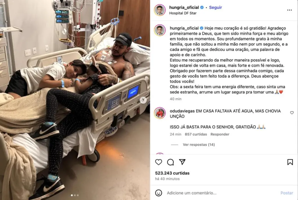 Em seu relato, Hungria destacou a força que encontrou na fé e no apoio da família. “Hoje meu coração é só gratidão! Agradeço primeiramente a Deus, que tem sido minha força e meu abrigo em todos os momentos”, escreveu ele. Além disso, ressaltou o suporte dos amigos e seguidores, que o têm acompanhado de perto.