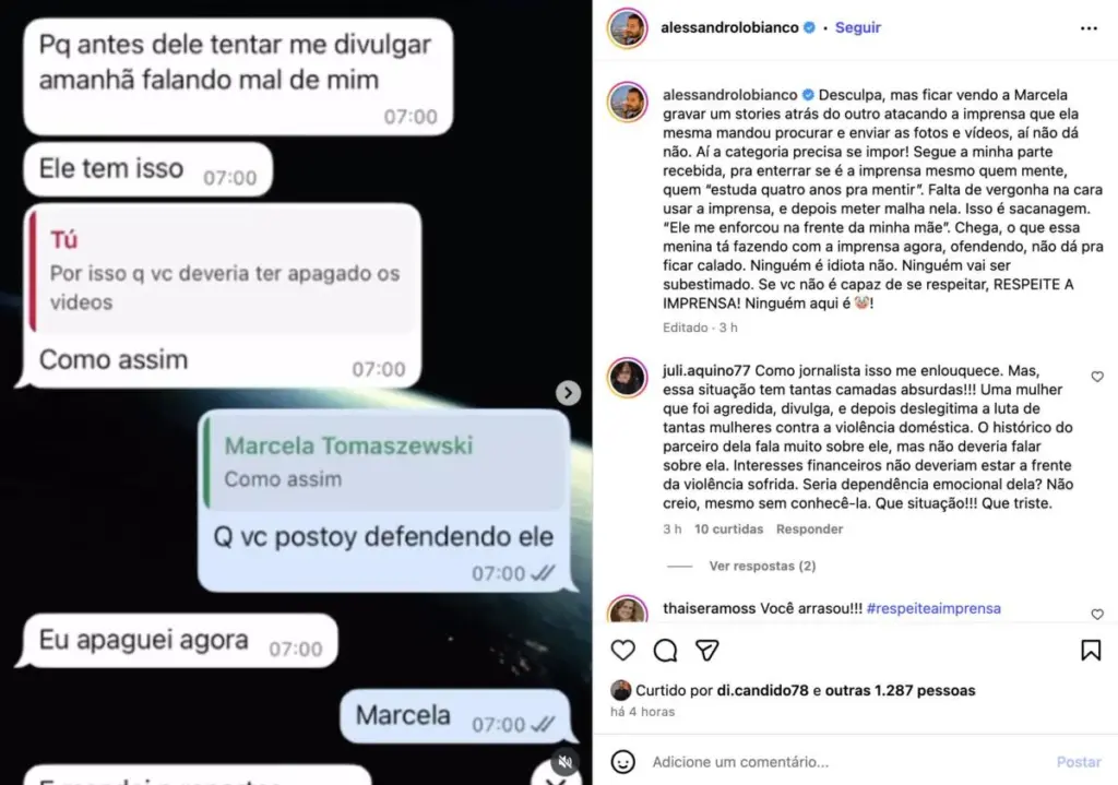 Na noite de terça-feira (4/11), o nome de Marcela Tomaszewski voltou a dominar as redes sociais e a imprensa. A modelo reapareceu no próprio perfil, negou agressões por parte de Dado Dolabella e ainda criticou jornalistas. Entretanto, poucas horas depois, novas mensagens atribuídas à miss reacenderam a polêmica ao confirmarem episódios de violência. Nesse cenário, o jornalista Alessandro Lo-Bianco resolveu se manifestar publicamente.
