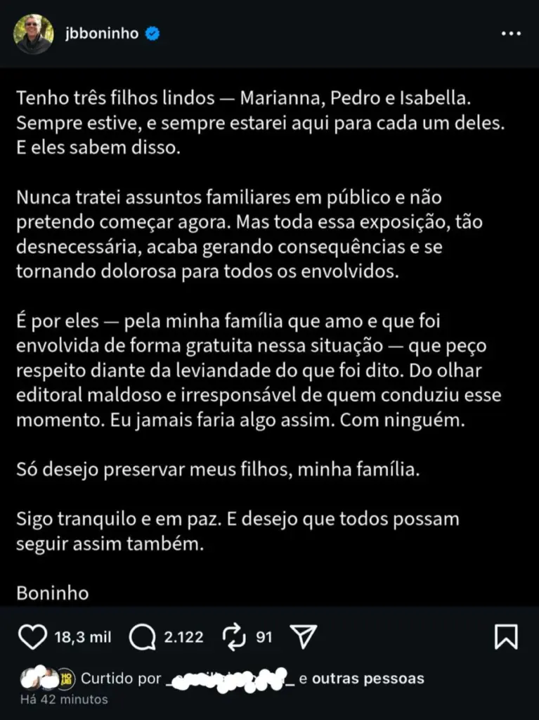 Em seguida, Boninho destacou a necessidade de preservar seus filhos e minimizar danos emocionais. “É por eles — pela minha família que amo e que foi envolvida de forma gratuita nessa situação — que peço respeito diante da leviandade do que foi dito. Do olhar editorial maldoso e irresponsável de quem conduziu esse momento. Eu jamais faria algo assim. Com ninguém. Só desejo preservar meus filhos, minha família. Sigo tranquilo e em paz. E desejo que todos possam seguir assim também”, finalizou.