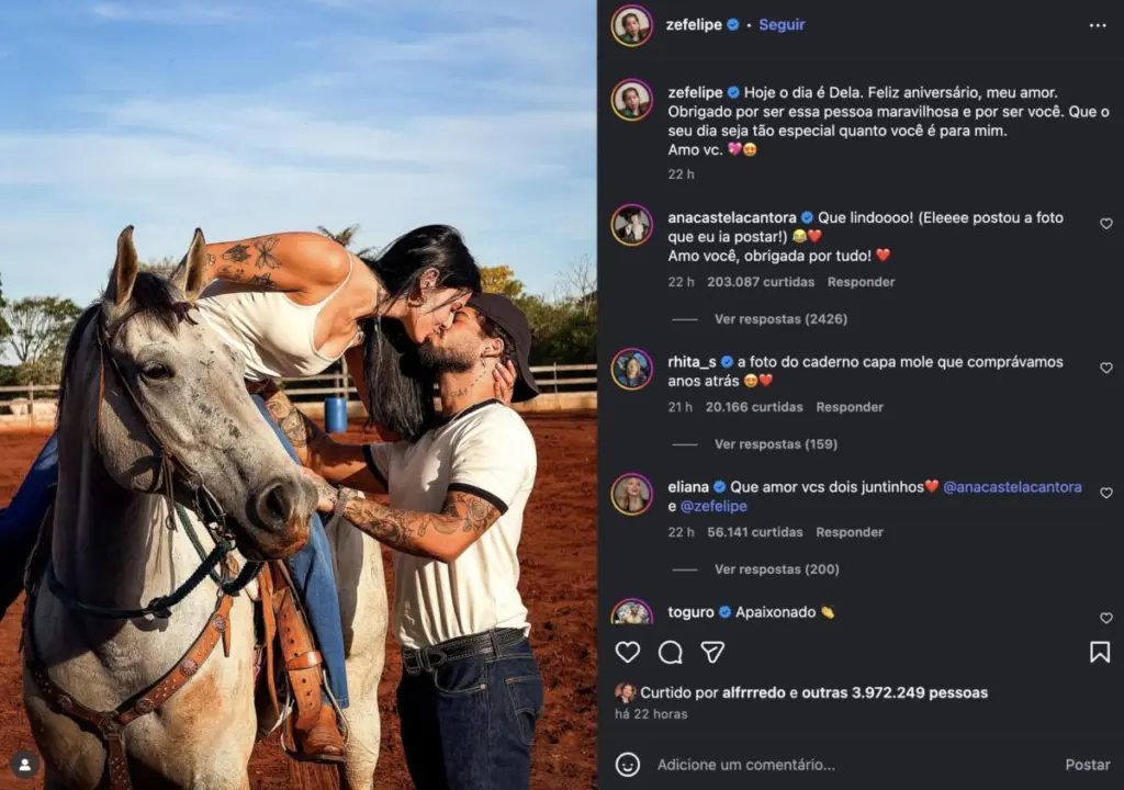Zé Felipe tomou conta das redes sociais neste domingo (16/11) ao fazer uma declaração calorosa para Ana Castela, que comemorou mais um ano de vida. Ele publicou uma foto dos dois se beijando em cima de um cavalo e, logo depois, reforçou todo o carinho que sente pela namorada: “Hoje o dia é Dela. Feliz aniversário, meu amor… Amo vc”, escreveu, arrancando uma enxurrada de reações dos fãs.