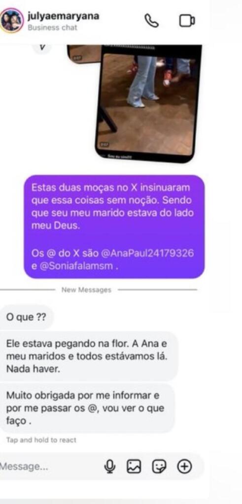 Sendo assim, com a repercussão da cena, a moça em questão chamada Maryana, que faz dupla com a irmã July, comentou sobre a suposta traição. Ela afirmou que seu marido estava ao lado e que Zé Felipe estava apenas pegando na flor em sua mão: “Ele estava pegando na flor. A Ana, meu marido e todos estavam lá. Nada haver.”