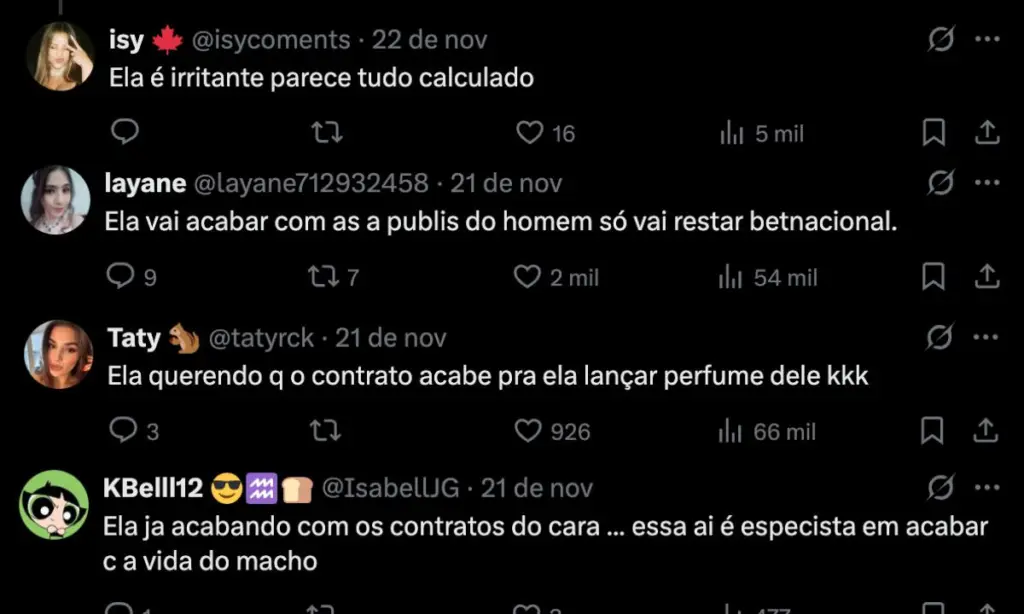 Assim que o trecho viralizou, muitos seguidores passaram a fazer comentários afirmando que Virgínia estava acabando com as publicidades do namorado: “Ela ja acabando com os contratos do cara … essa ai é especista em acabar c a vida do macho” e “Ela querendo q o contrato acabe pra ela lançar perfume dele kkk” dominaram a discussão. Outro internauta ainda provocou: “Ela vai acabar com as a publis do homem só vai restar betnacional.”.
