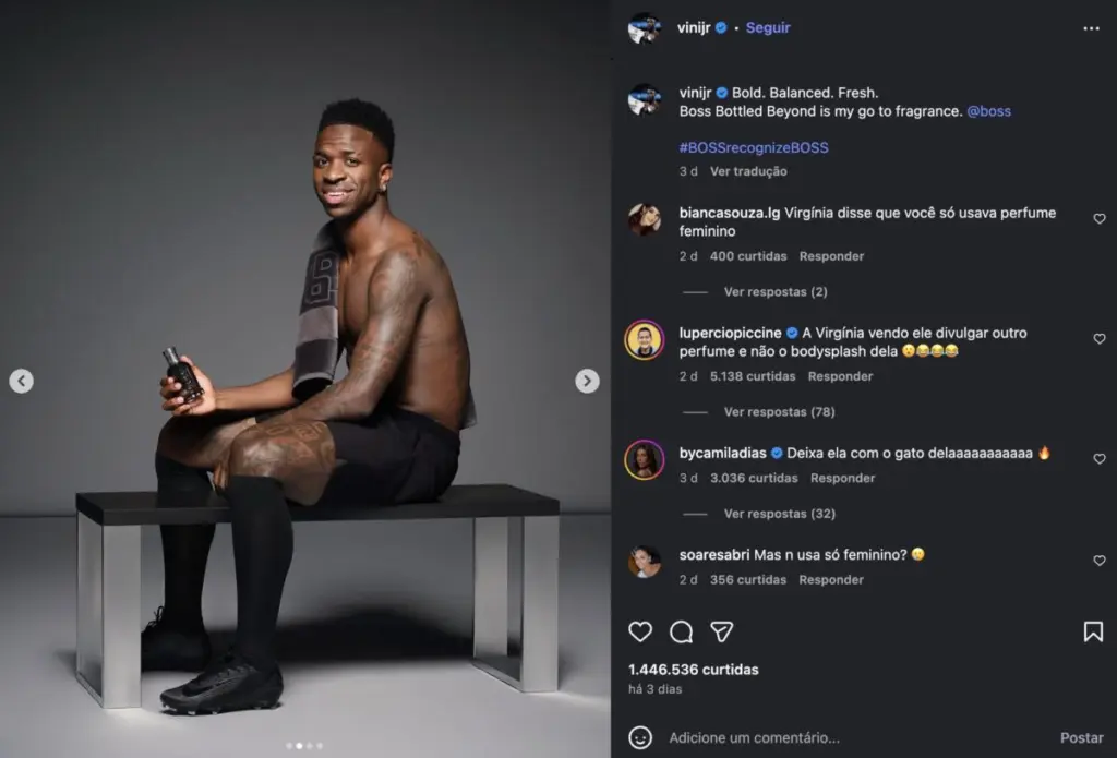 Na noite na última sexta-feira (21/11), Virgínia Fonseca surpreendeu o público ao comentar, durante a live de sua marca, um detalhe inusitado sobre os hábitos de Vini Jr. Ela puxou o assunto de forma descontraída e acabou revelando que o namorado não costuma aderir aos perfumes criados para o público masculino. Acontece que um dia antes, o jogador divulgou um ensaio sobre uma marca internacional de perfume voltada para homens.