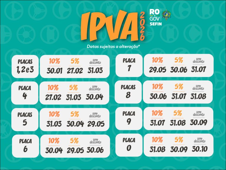 PORTO VELHO-RO: O governo de Rondônia, por meio da Secretaria de Estado de Finanças (Sefin), divulgou o calendário de pagamento do Imposto sobre a Propriedade de Veículos Automotores (IPVA) 2026. Os prazos são escalonados conforme o número final da placa do veículo e contemplam opções de quitação antecipada com descontos para os contribuintes.