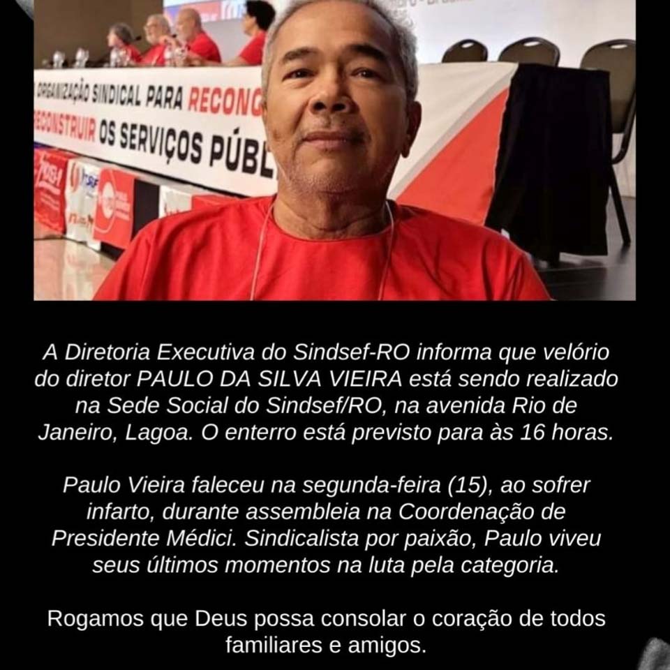 A Diretoria do Sindsef-ro informa que o velório do diretor Paulo da Silva Vieira, está sendo realizado na Sede Social do Sindicato, na avenida Rio de Janeiro, bairro Lagoa.