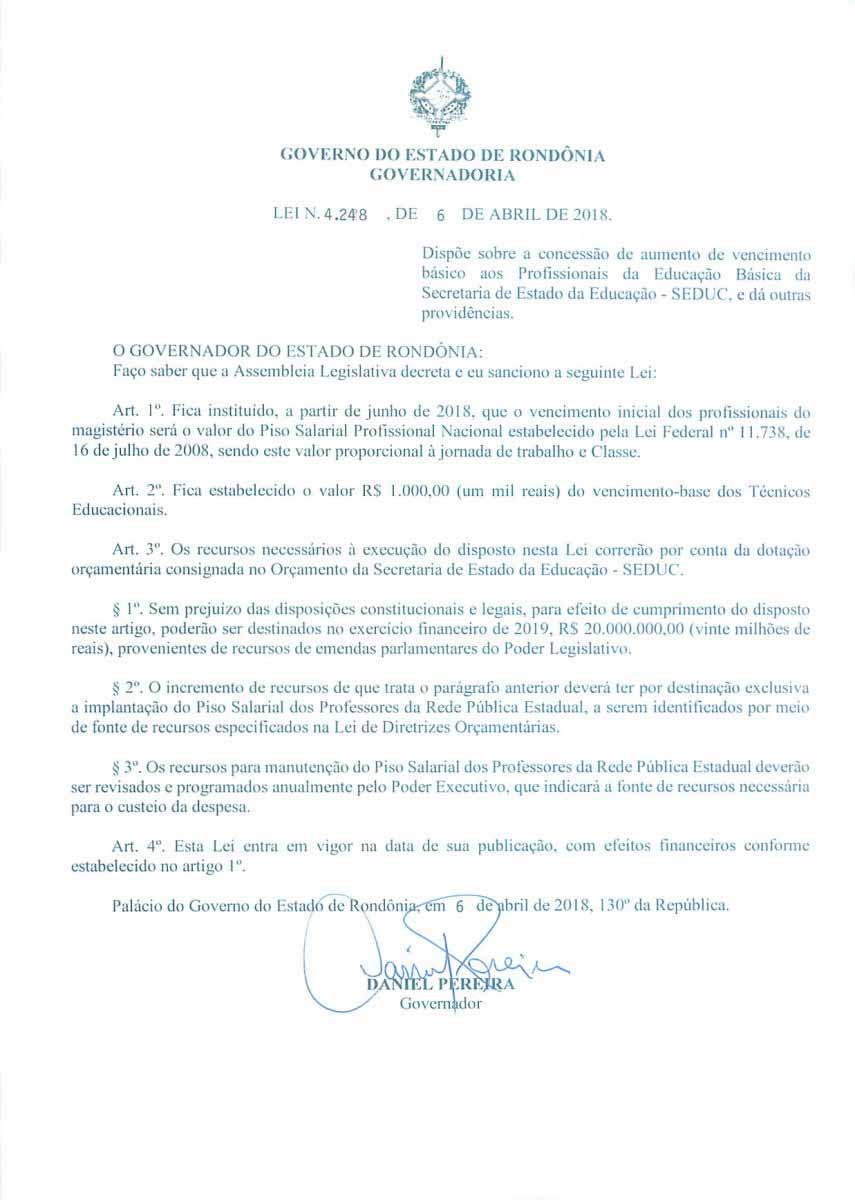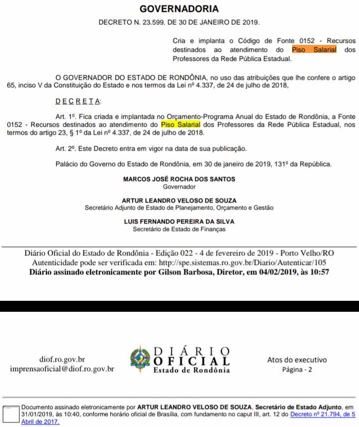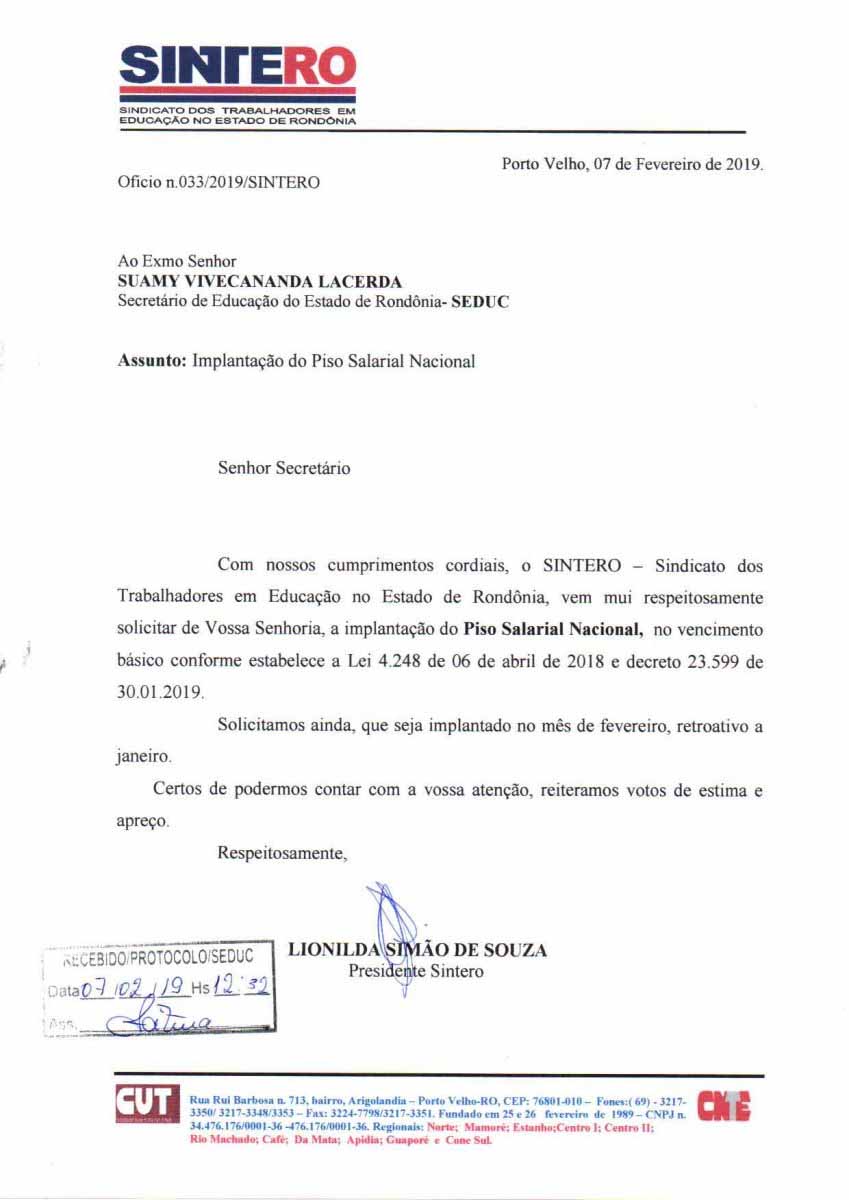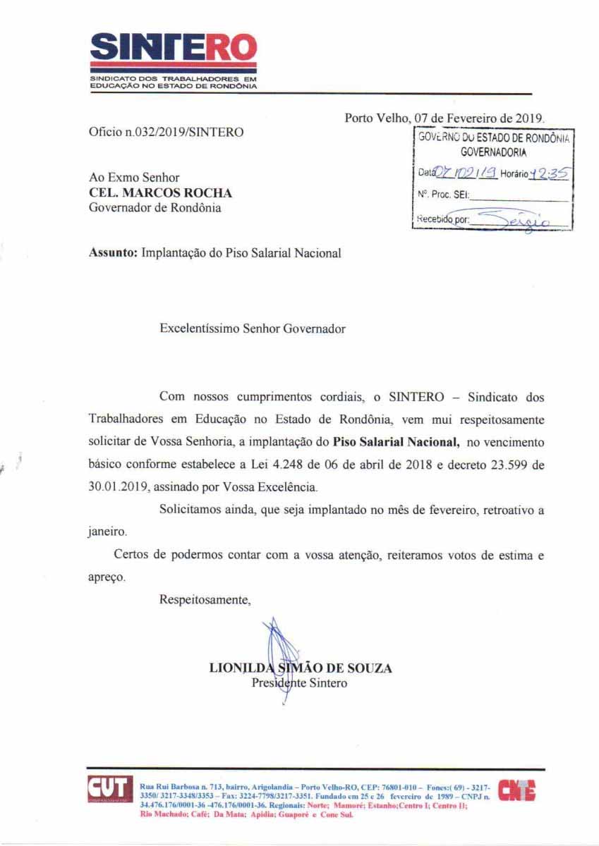 PORTO VELHO RO - A Direção do Sintero encaminhou nessa quinta-feira (7) ao Governo do Estado, e à Secretaria de Educação, um ofício solicitando que a implantação do Piso Salarial Profissional Nacional do Magistério seja pago no mês de fevereiro, mas com efeito retroativo a janeiro de 2019, conforme a Lei nº 4.248/2018 e Decreto nº 23.599/2019.