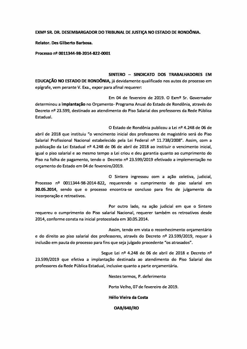 Também na quinta-feira, o Sintero, através de sua assessoria jurídica, também encaminhou petição ao Tribunal de Justiça de Rondônia requerendo a inclusão do processo nº 0011344-98.2014.822 em pauta de julgamento, reforçando que o governo do Estado já reconheceu no orçamento o direito dos professores de receberem o piso no vencimento.