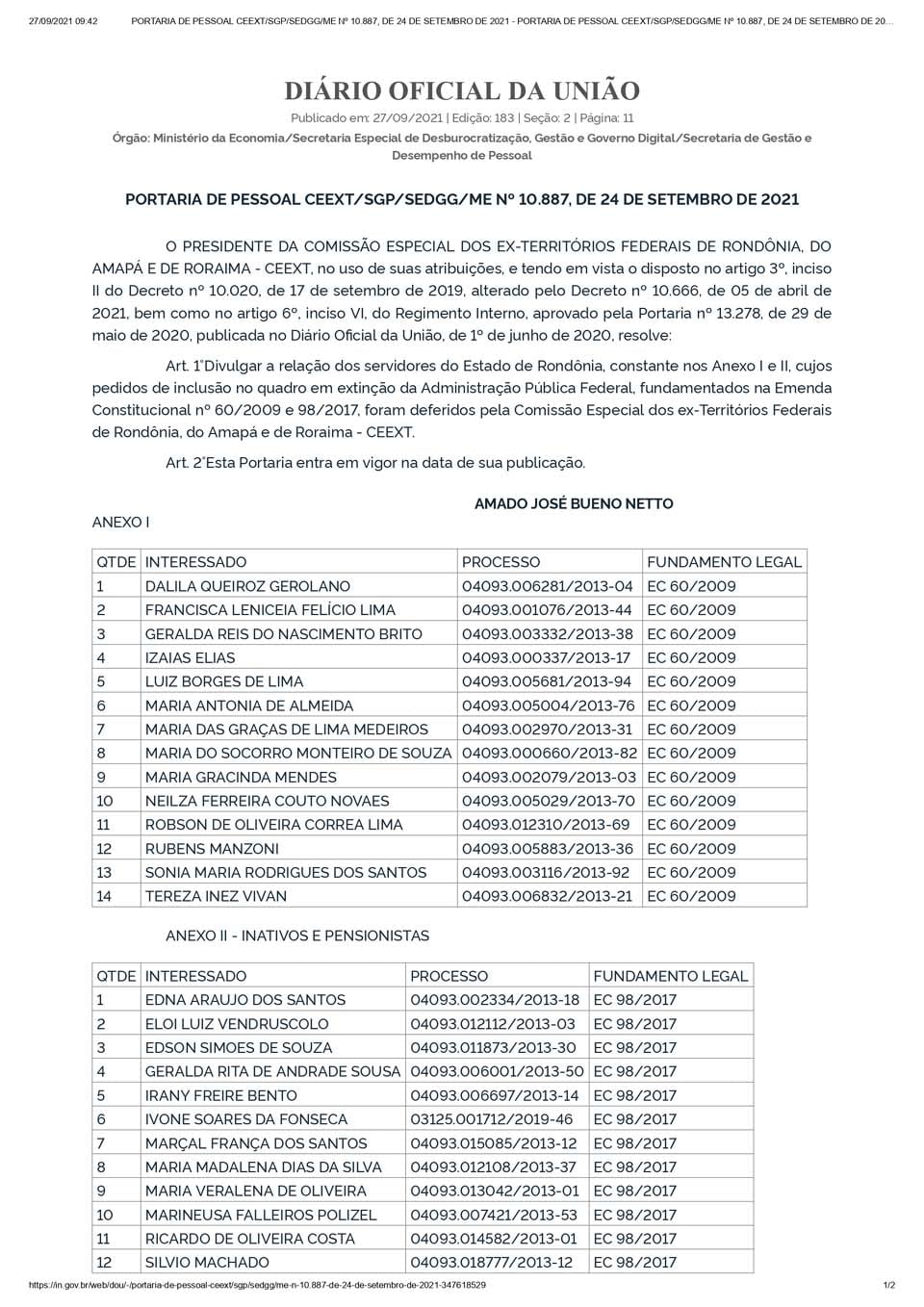 RONDÔNIA - Portaria da Comissão Especial dos ex-Territórios Federais de Rondônia, do Amapá e de Roraima – CEEXT, divulgada no Diário Oficial da União concede transposição para servidores do Estado de Rondônia, inclusive aposentados, com fundamentados na Emenda Constitucional nº 60/2009 e 98/2017. CONFIRA: