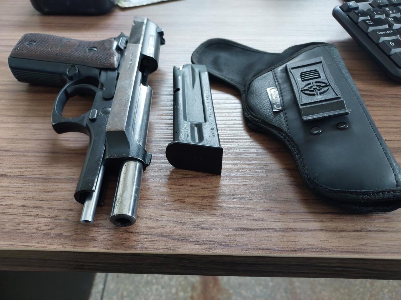 No endereço informado, uma residência na rua 916, os policiais fizeram uma averiguação onde localizaram uma pistola Taurus, modelo PT-765 e um carregador desmuniciado.