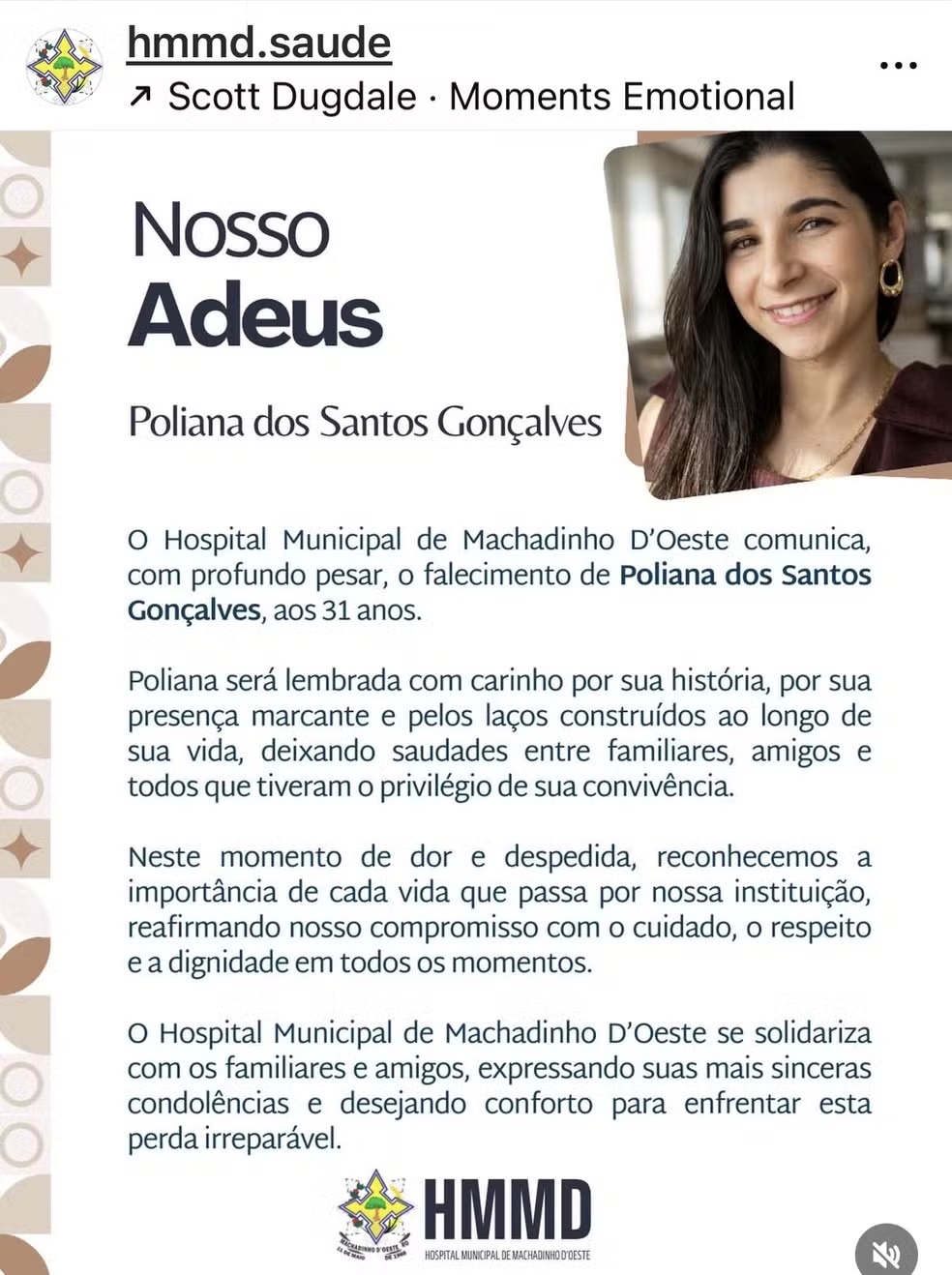 Poliana trabalhava no Hospital Municipal de Machadinho D’Oeste, que divulgou nota lamentando a morte da servidora.