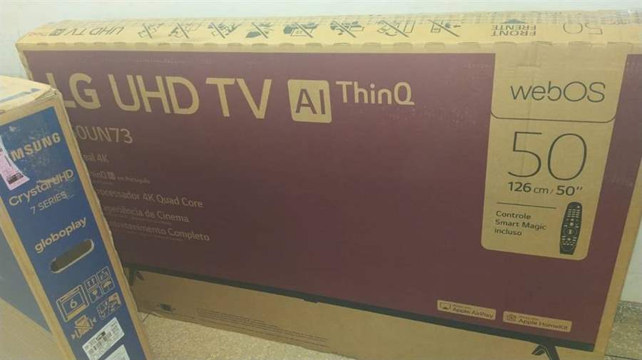 Na casa do acusado, foi encontrado o aparelho televisor de 50 polegadas, outro aparelho televisor e um celular de procedência duvidosa, que inclusive ainda estavam nas caixas.