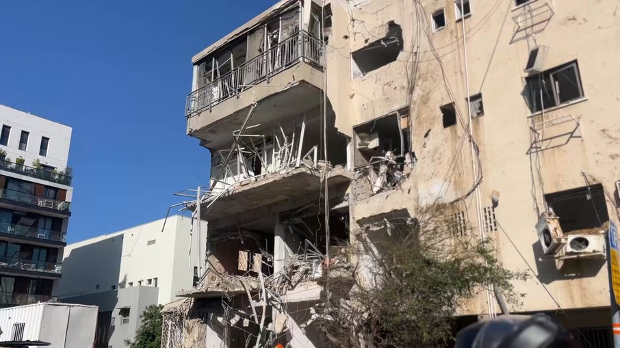 As sirenes de alerta tocaram em várias cidades israelenses. Em Tel Aviv, imagens mostram um edifício com gandes danos estruturais. Não está claro se o impacto foi direto ou causado por destroços de interceptações.