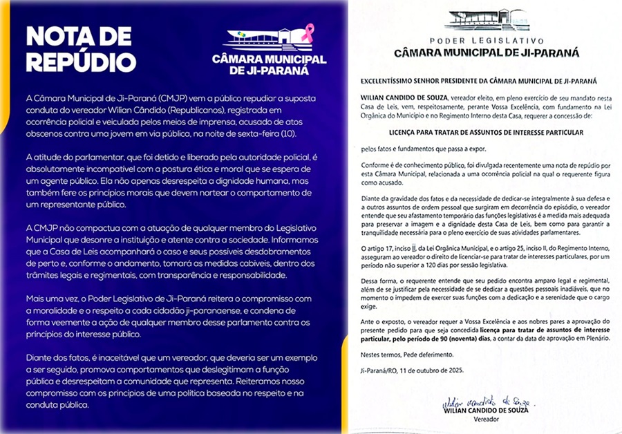 JI-PARANÁ, RO - O vereador Wilian Cândido de Souza (Republicanos), de Ji-Paraná, pediu afastamento de 90 dias de suas funções neste sábado (11), um dia após ser detido sob suspeita de ato obsceno e importunação sexual. No documento protocolado na Câmara Municipal, ele alegou que a medida tem como objetivo tratar de assuntos pessoais e preparar sua defesa.