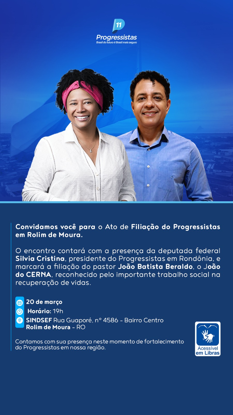 RONDÔNIA - A presidente regional do Partido Progressistas e pré-candidata a senadora, Sílvia Cristina, destacou a filiação do pastor João do Cerna, como uma liderança que vem para fortalecer ainda mais o Progressistas. Ele cuida de dependentes químicos e do alcoolismo, em Rolim de Moura, e é pré-candidato a estadual e ato de filiação ocorre às 19h desta sexta-feira (20), na sede do Sindsef, em Rolim.
