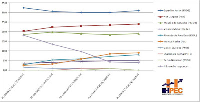 Seguem dados e gráfico das últimas quatro pesquisas registradas pelo IHPEC, com o devido número do registro e a data da publicação. Algumas já foram divulgadas, outras não. O Instituto está realizando uma pesquisa por semana para Governo, Senado, Deputado Federal e Estadual.